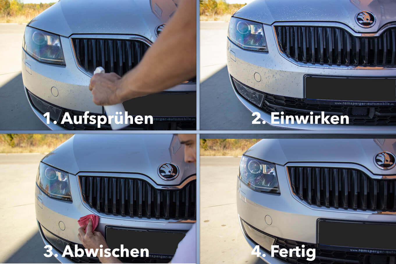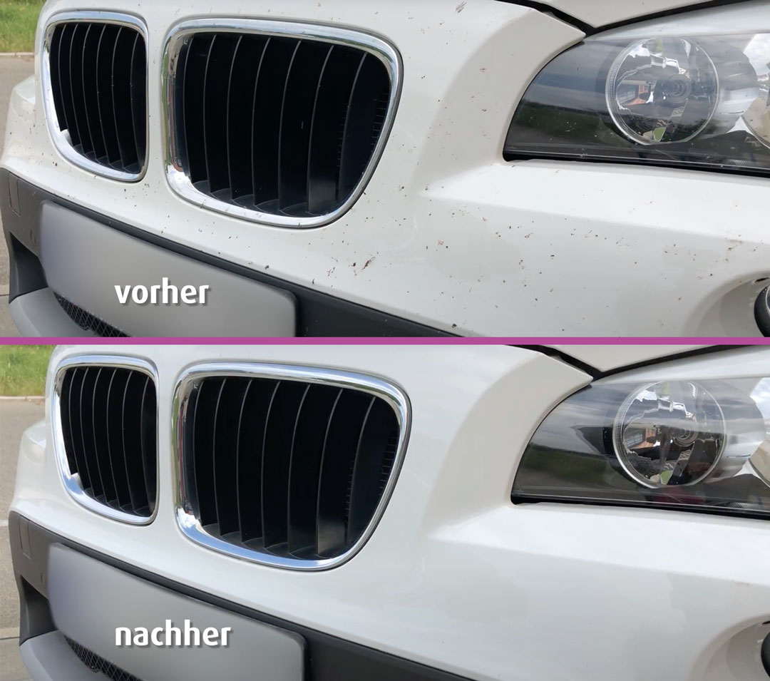 Reinigungskonzentrat zur Entfernung von hartnäckigen Verschmutzungen auf Autos. Tote Insekten, Vogelkot, Blut, Fett, Silikonrückständen und sonstige Verschmutzungen auf dem Kühler, der Motorhaube und den Autoscheiben sind damit einfach zu entfernen.