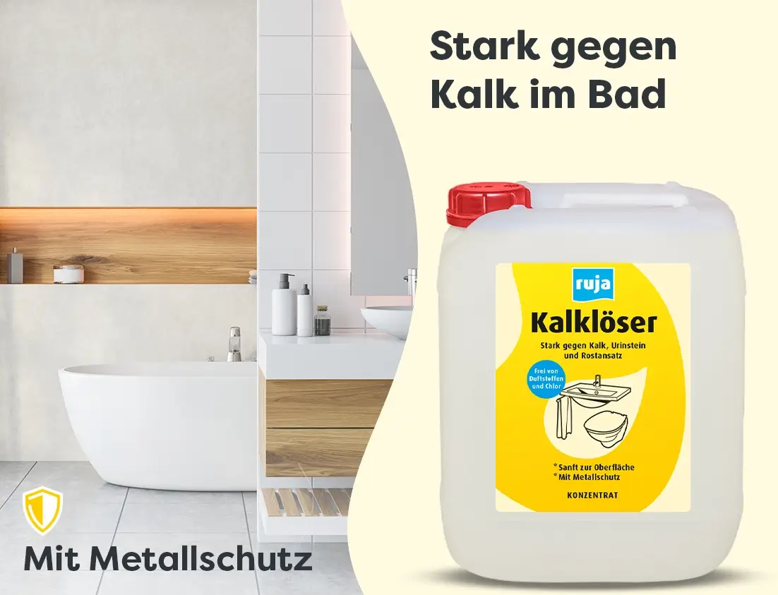 Der Kalklöser ist für alle säurebeständigen Oberflächen im Badezimmer geeignet. Dazu zählen unter anderem Waschbecken und Armaturen, Toilette, Bidet, Dusche und Fliesen. Doch nicht nur Kalk lässt sich damit entfernen: Die enthaltenen Tenside sorgen dafür, dass der Kalklöser auch Seifenreste, Zementschleier, Wasserflecken, Urinstein und Verschmutzungen beseitigt.Unangenehme Gerüche verschwinden in der Regel nach einer gründlichen Reinigung mit unserem ruja Kalklöser ebenfalls.