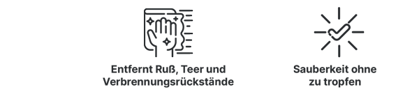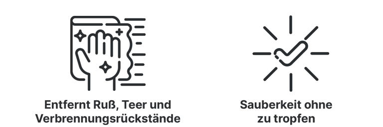 Der Reinigungsschaum arbeitet sich in kurzer Zeit unter den Schmutz und sorgt dafür, dass alter Ruß sich mit einem Wisch entfernen lässt – ohne Tropfen und Sauerei.
