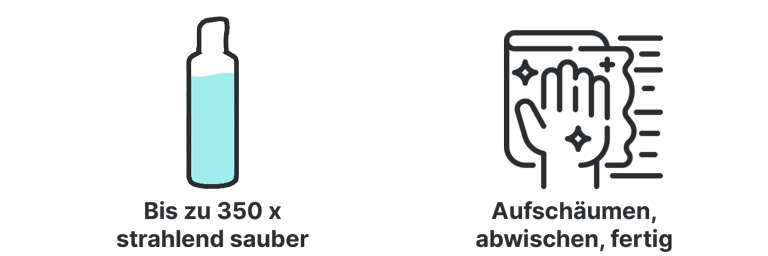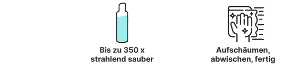 Den Schaum einfach aufsprühen, mit einem Tuch verteilen, abspülen und trocknen lassen. Dabei sind auch senkrechte Flächen schnell geputzt, denn der Schaum haftet und sorgt so für eine gründliche Reinigung.