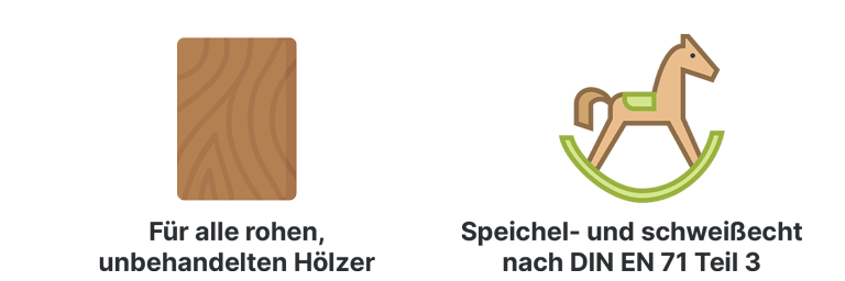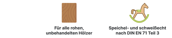 Nach der Abtrocknung werden von allen behandelten Oberflächen keine gesundheitsschädlichen Lösemitteldämpfe abgespalten. Das Produkt ist Speichel- und schweißecht gemäß DIN EN 71 Teil 3. Den Prüfbericht können Sie einsehen, wenn Sie auf den folgenden Button klicken.