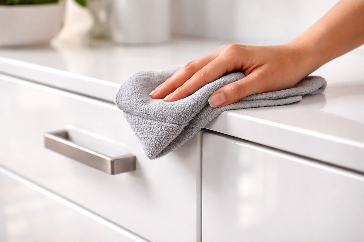 Die Oberfläche mit einem feuchten Tuch abwischen. In hartnäckigen Fällen vor dem Abbürsten kurz einwirken lassen und wo möglich mit einer Bürste arbeiten.