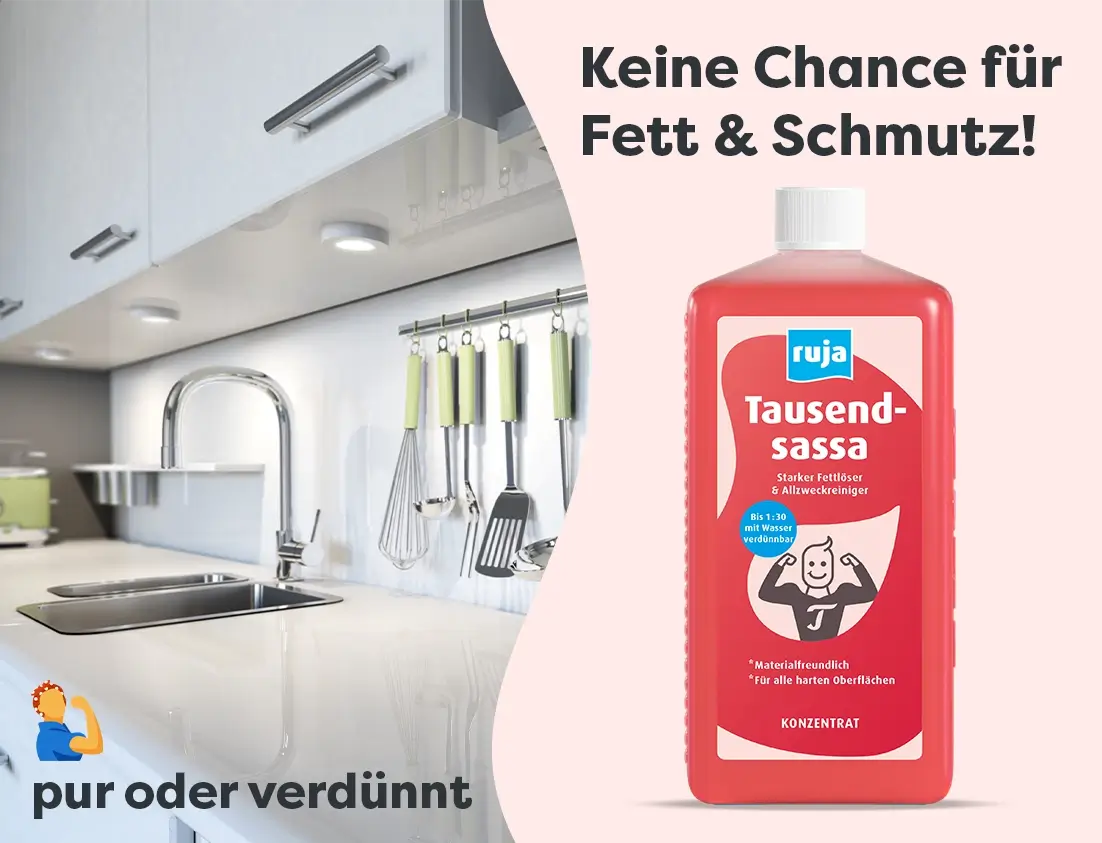 Besonders bewährt hat sich unser Tausendsassa in der Küche, bei der Reinigung stark verschmutzter Oberflächen wie Dunstabzugshauben. Auch Rückstände von Nikotin in Raucherhaushalten lassen sich mit unserem Tausendsassa gut wieder entfernen.