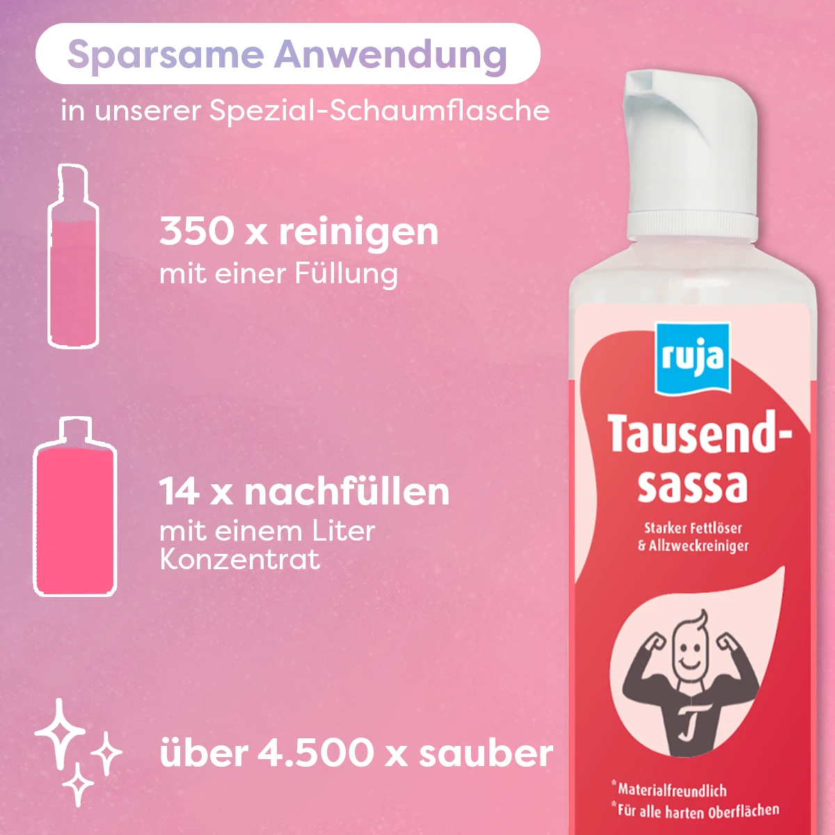 Zunächst ca. 2 Finger breit Tausendsassa einfüllen, anschließend mit Wasser auffüllen und etwas Luft im Behälter lassen. So bleibt die Schaumbildung optimal. Ein Liter Konzentrat ergibt über 5.250 Anwendungen.